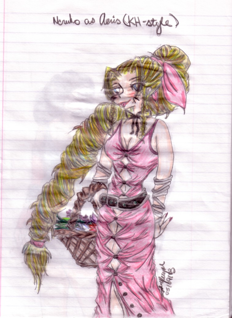 I saw a pic of Naruto as Naruko as Aeris on a Japanese site (my deepest apologies to the original artist), which inspired me to draw this, which is pale by comparison. And no, it's not a direct copy. *glares* My friends love how the dress turned out. ^_^ My brother, on the other hand, calls her "tornado hair". -_- She's supposed to be "Kingdom Hearts" style Aeris(Aerith, whatever). Pencil crayon on 8 1/2 by 11".