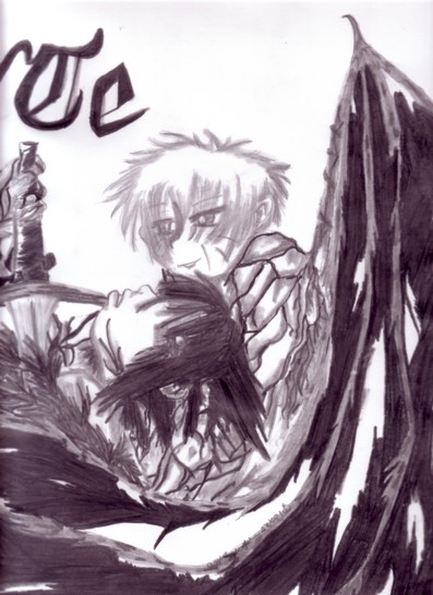 MWHA! This is my BEST. PIC. EVA! There's more to it, but it's currently in my locker and my scanner doesn't like me for some reason, so I doubt it'd make stitching up several parts EASY. Demon Naruto is killing Angel Sasuke. The caption says "Black and White". 6B pencil on 14 by 17" paper.