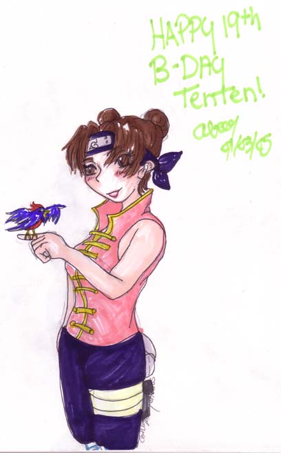 Happy 19th to Tenten! Pencil on 8 1/2 by 11"; coloured with markers. Don't ask about the bird. I dunno.