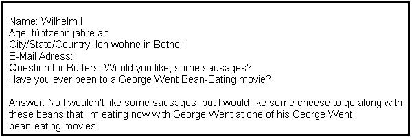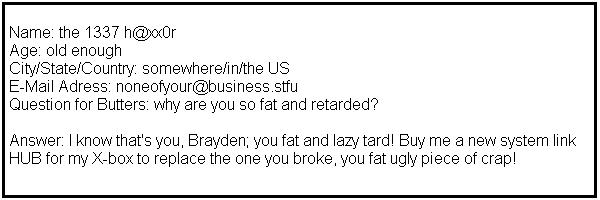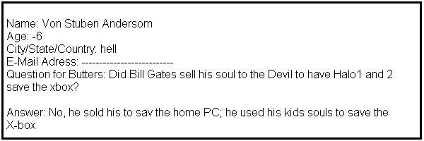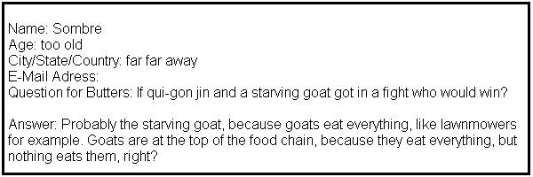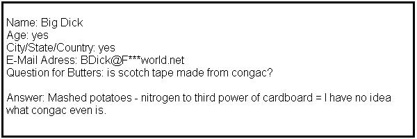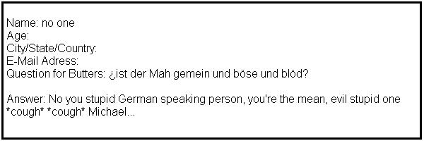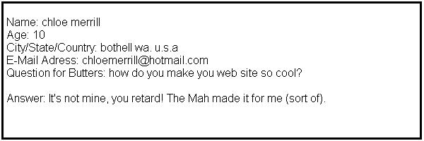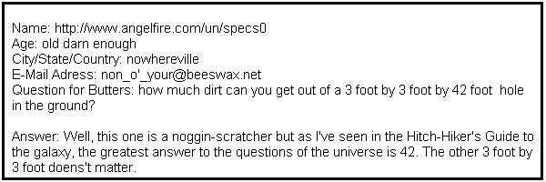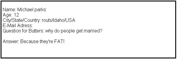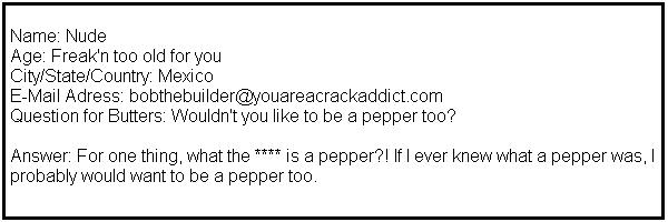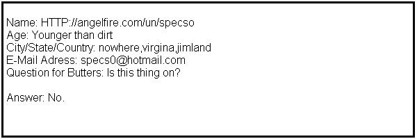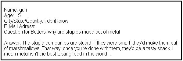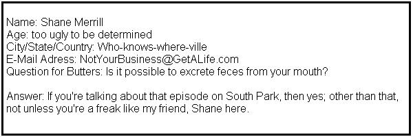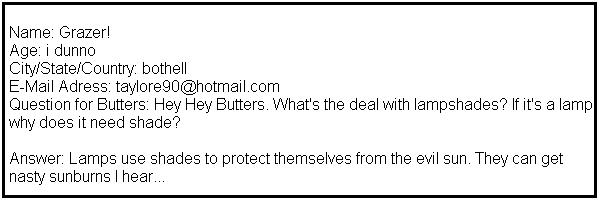 Ask Butters![]() Welcome to Ask Butters! Butters is a friend of the Mah, as is Zulu Bacon. You ask Butters questions, by clicking on the link below, he writes back answers on this page. Don't feel forced to reveal any info like your real name or age. That's strictly optional.