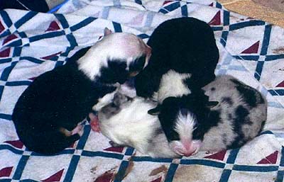 ![]() A group shot of the four babies - 1 blue boy, 1 black boy (top left), 2 black girls (one hidden under the other pups). Taken the day of birth. |