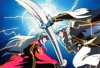 | He believes that his hanyou half brother isn't worthy of the sword and sets out to find ways of obtaining it for himself. Tetsusaiga was the sword InuYasha used to hack off Sessoumaru's left arm, and since then Sesshoumaru has made several attempts to obtain the sword even though he is unable to wield it with his full youkai blood. This leads to a one-time alliance with Naraku. Naraku gave Sesshoumaru a human arm with a piece of the Shikon no Tama embedded in it. With this arm Sesshoumaru was able to transform the Tetsusaiga and show its true power to InuYasha when he released the Kaze no Kizu. Eventually however Sesshoumaru seems to stop pursuing the Tetsusaiga. Does he not want it any more, or has he given up on it? The true reason is never stated although three significant events happen around the time he stopped pursuing the sword. 1) He was nearly killed by the sword when InuYasha accidentally unleashed the Kaze no Kizu. 2) He obtained the Toukijin which is seen as the Tetsusaiga's equal in terms of power. and 3) Sesshoumaru discovered that the Tetsasugia was not only a powerful sword, but it also served as the seal for InuYasha's youkai blood. The sword keeps the youkai blood from taking over his mind and making him go on a killing spree. When Sesshoumaru discovered this he paid a visit to InuYasha to see it for himself. However he did not make an attempt on InuYasha's life, he even told Kagome that she should use the Tetsusaiga to revert him back to normal. And then he left them alone. |