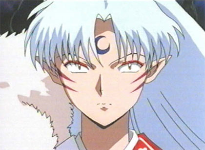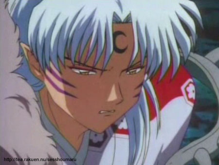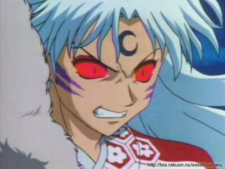 {The Transformation} | He is able to transform at his own will and stay in controll of himself. His transformation seemed to come easily to him. It starts of with his eyes still white, but his pupils become smaller. Then slowly, the stripes on his cheeks thicken until they become jagged; the color changes a bit and his eyes go red with his pupils turning purple. Sesshoumaru looks like InuYasha during the "youkai blood taking over" except InuYasha stays that way, and Sesshoumaru's transformation goes much further. His nose eventually elongates so he looks like a human with a dog nose and mouth. During his transformation the wind starts blowing harder and harder until it eventually looks like a cyclone surrounding him, and thats when he completes his transformation. |