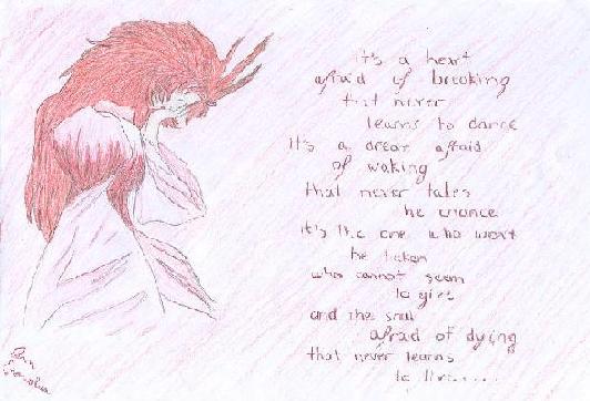 Above is a picture of Kuja in trance!!! It says: it's a heart afaid of breaking that never learns to dance, it's a dream afraid of waking that never takes the chance, it's the one who won't be taken who never seems to give, and the soul afraid of dying that never learns to live...