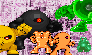 This monstrosity first appeared in MM1 as the Yellow Devil. This yellow/orange goo that composed the body was the most common. It attacked mainly by firing beams from the eye, or by disassembling the main body and hurling chuncks of itself. The Yellow Devil returned in MM3, with a slightly different appearence, but the same overall attacks.