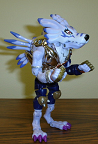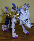 Looks good as both forms, although it's mostly just Garurumon standing up on his hind legs, and his arms switched. WereGarurumon's feet placement makes it hard to stand him up as well. A nice touch here was the spring-loaded opening/closing mouth. Includes a WereGarurumon holo trading card. (The image above is of the metallic plated version, BTW)
