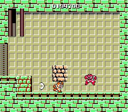 The boss of this area is the first of many appearences throughout the series: The Yellow Devil (aka Yellow Demon, Rock Monster, Cyclops). It consists of a mechanical eye lodged in a body made of some kind of yellow goo. It shoots beams from the eye, but its major attack is to disassemble itself, hurling chunks of itself at you before reassembling on the other side of the room. This is certainly the toughest version of it right here, and it may take you several tries until you defeat it. When the monster throws chunks at you, it does so in a set pattern. Realizing the pattern is the key to avoid getting hit. When the eye opens, shoot it with the Thunder Beam. You'll probably only get one shot before it closes and repeats the pattern. You can also cheat and use the Pause trick (After firing your shot, hammer the Select button to pause and unpause the game. The beam will travel slowly through the enemy, making a hit with every slight movement it makes), but it's much more gratifying to beat it the right way...