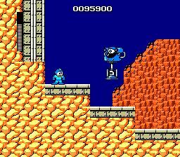 Following this walkthrough, you'll encounter your first BigEye near the end of this stage. These monstroseties guard several of the robot masters' rooms, as well as Wily's fortress. They're tough to kill and dish out lots of damage. Try to run under it if you can.