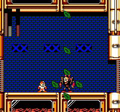 As you probably expect by now, you'll fight Doc Robot again at the halfway point. He now has Woodman's abilities. The Leaf Shield does tremendous damage, so avoid it at all costs. Pummel him with the Needle Cannon as much as you can as soon as you jump the shield before he puts up another.