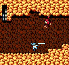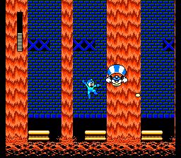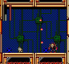Protoman fights you again in the last part of the stage, but its a bit different from the last couple times. The floor isn't flat, so he just jumps around, shooting at you. You sould be able to handle him by now though; he's still easy to figure out.