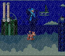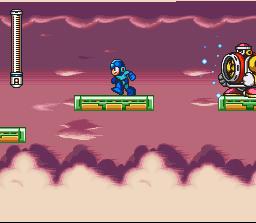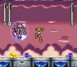 There will be one point where you'll have to cross a chasm on cloud-looking platforms similar to the ones the Lightning Lords used in MM2. Luckily, all of the clouds are vacant. Try shooting them with the Freezr Cracker...