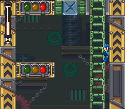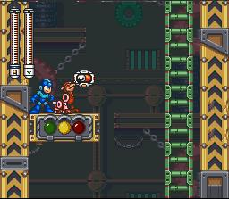 This first section features the old track platforms from Gutsman's level (the ones that dump you when it crosses a break in the track), but with a new twist; the lights go out when you're standing on them!! You'll have to hop around just to be able to see where you're going, then jump when the time is right.