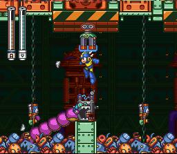 These robots walk on the ceiling and drop icicles on you. They stay on the ground for a moment, and you can use them as platforms. Take advantage of this to cross a couple of spike pits in this section, much like MMW1.