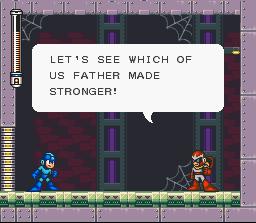 Bass: At the end of the stage, you'll have your very first run-in with Bass. He's really easy, though. All he does is jump and shoot in place. After shooting him enough, you'll exchange some dialogue, then he'll leave. (Actually, the story will continue no matter how you do in this fight, but the dialogue is slightly different to reflect how you did.)