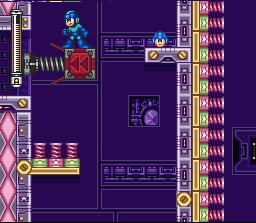 When the path splits on the downward shaft, take the right fork, past the time-bomb platforms to get an energy tank. Later, use Rush Coil to get to the 1-up. You'll have to position him on spikes, but that's okay, since Dr. Light made Rush's feet spike-proof, but not Megaman's... |:(