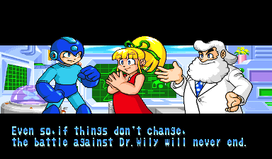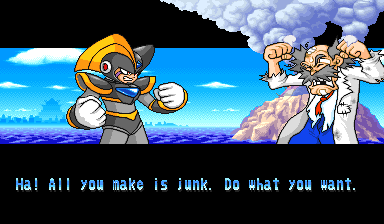 Bass's Ending: Dr. Wily asks Bass why he fought against him, and Bass relpies by declaring that he has proven he is Wily's strongest robot and that he's all Wily needs to destroy Megaman. Wily seems unimpressed, however, and announces that he building a new robot that is way out of Bass's league. Bass just scoffs and then leaves.