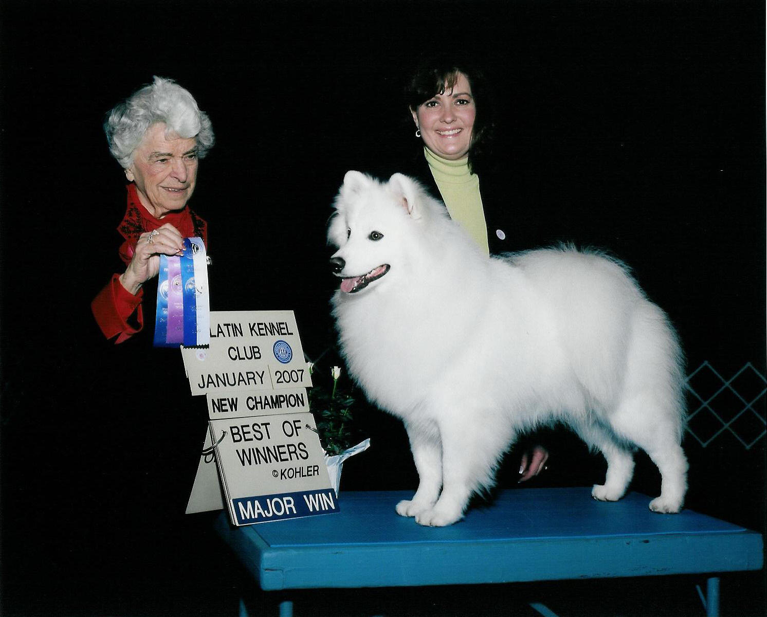 Apollo became an AKC CH at the age of 13 months after competing in just three Shows. He finished with 4 majors and 17 points! Here is his photo from the Rose City Classic in Portland taken on January 21, 2007. This was a 5 pt major Best of winners!