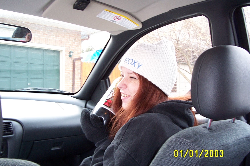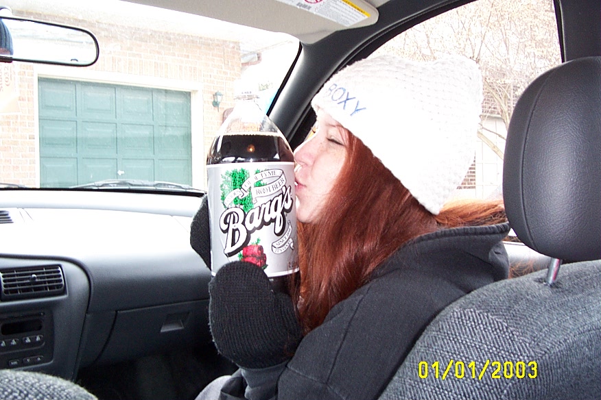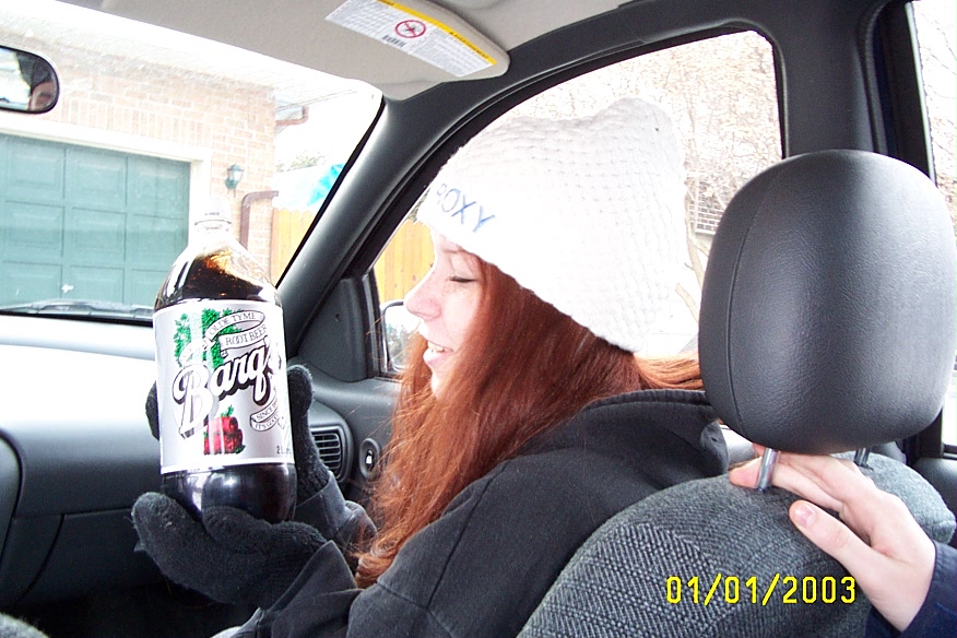 in jeff's car. trying to hold up barq's. it wasnt working.