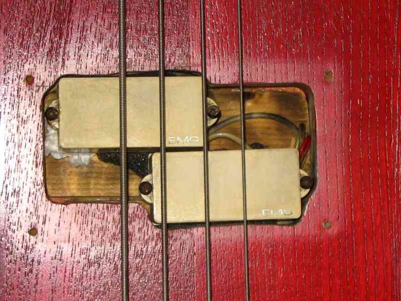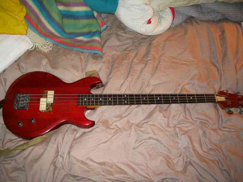 My Aria Pro 2 Bass. I bought this for $70 because it was in a fire. Believe it or not, this bass is awesome! Someone retrofitted a pair of EMG pickups in it so it sounds killer. I cannot tell you how many offers I have gotten for this bass but I won't sell it! It was used on all the CJE releases, the Macdonalds demos, and on a song off of the Sack Lunch EP.