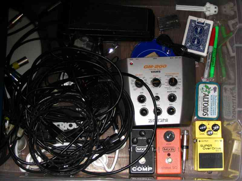 Just some pedals and crap that have fallen out of favor, waiting to be cycled back into my pedal board. I will probably use the stormtrooper Pez despencer for my clean sound on the next record.