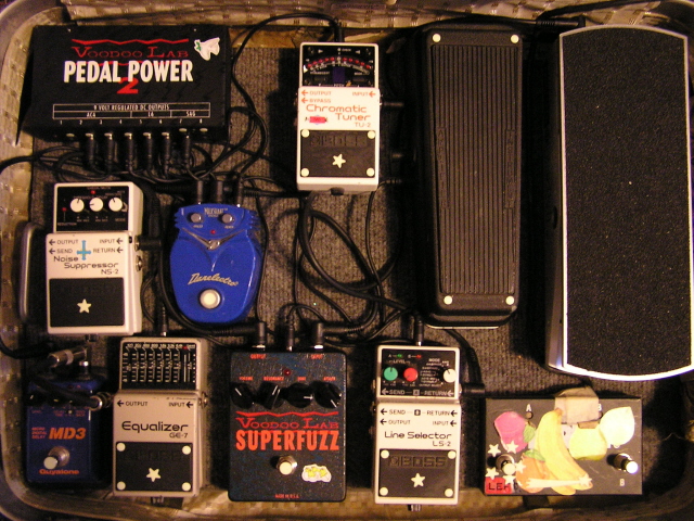 Effects: Ibanez Turbo Tube Screamer, Guyatone Micro Delay, Danelectro Milkshake chorus, MXR Phase 90, MXR Super Comp, Analog man modded Boss DS-1, Boss TU-2 tuner, Boss Graphic eq, Boss CE-2 Chorus, Boss Line Selector, Voodoo Lab Super Fuzz, Boss Noise Supressor, Cry Baby Wah, Ernie Ball Volume, Voodoo Lab Pedal Power 2