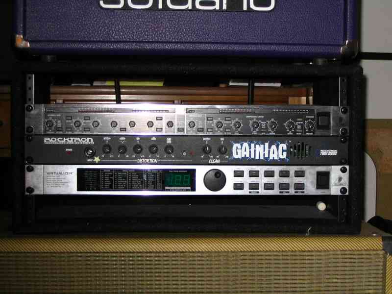 Some unused rack gear including a Behringer Compressor/Limiter, Rocktron Gainiac, and Behringer Virtualizer. I have used the Gainiac's clean channel in my old Last Stretch Rig and on the Last Stretch Demo with my Fender Prenceton Chorus for my clean sound. The distorted channel sounds terrible so I use it for low-fi sounds now and again.