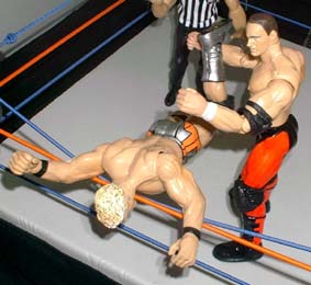 Bret - "Jarrett reaches the ropes and both men are back on there feet "