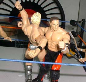 Bret - "It looks like Storm has the upperhand at the moment. He scoops up Jarrett and drops his throat across the top rope "