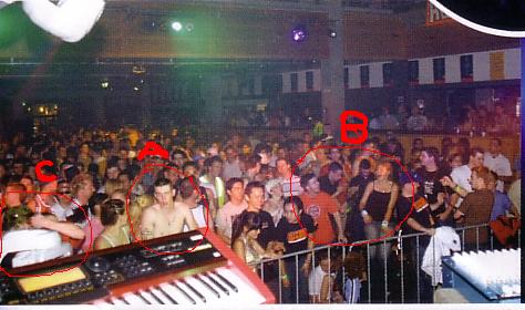 Let's look first at Subject C, since I like disorder. Disorder it evidently is amongst this close-knit group of friends too! They're letting each other have it like there's no tomorrow. I reckon if this photo had been taken a second later, Greenhead's head would have snapped back out of the frame. Moving to B, we have a few possible scenarios. Either (a)these two are long lost friends who are recoiling in shocked delight to see each other in the middle of a mosh pit, (b)she has REALLY bad breath or (c)he just flashed her and she's laughing at his lack of meat. Hang on, I just noticed something going on below their red circle. Uh oh, it looks like somebody's passed out...or they're getting their next fix. Meh, s'all the same.