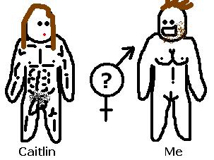 This one happened a long time ago so most of the details are a little obscure. The general gist of it was that I was a man, but with woman bits (as illustrated). Walking around a nice palace thing with white marble walls, I encountered a lovely young woman who turned out to be Caitlin...except she had a horrible secret. We retreated downstairs where it was a little more private, settled on the white floor tiles and started making out. Caitlin's skeleton was ripped out of the closet as her clothes came off - she was a MAN! So even though the situation was crazy it all worked out in the end. And you can all breathe a sigh of relief, as nothing actually happened after the clothes disappeared. Caitlin up and left me. Bitch...bastard...---------------- The Old Woman in the Shower Dream