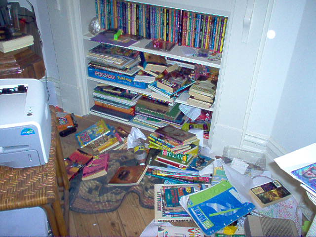 Okay, so my bookshelves aren't exactly a great hiding place for any books seeking refuge. The place is as messy as the rest of my room, which is why I try to show as little of it as possible - I want to retain at least SOME dignity. Now, I realise my copy of Pokémon Monopoly is in full view, and I'm not going to deny that I own a copy of it. I'm also going to point out that on the top shelf is the complete collection of Animorphs books. All the way from #1 to #54 plus Megamorphs, Alternamorphs and all the Chronicles. That's all, just wanted to boast.