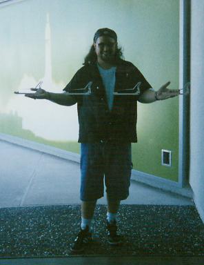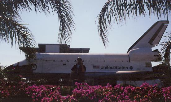 Nafa at Kennedy Space Center in March 2000 with one of his heroes, Yuri Gagarin, the first man in space, and with little shuttle decals.