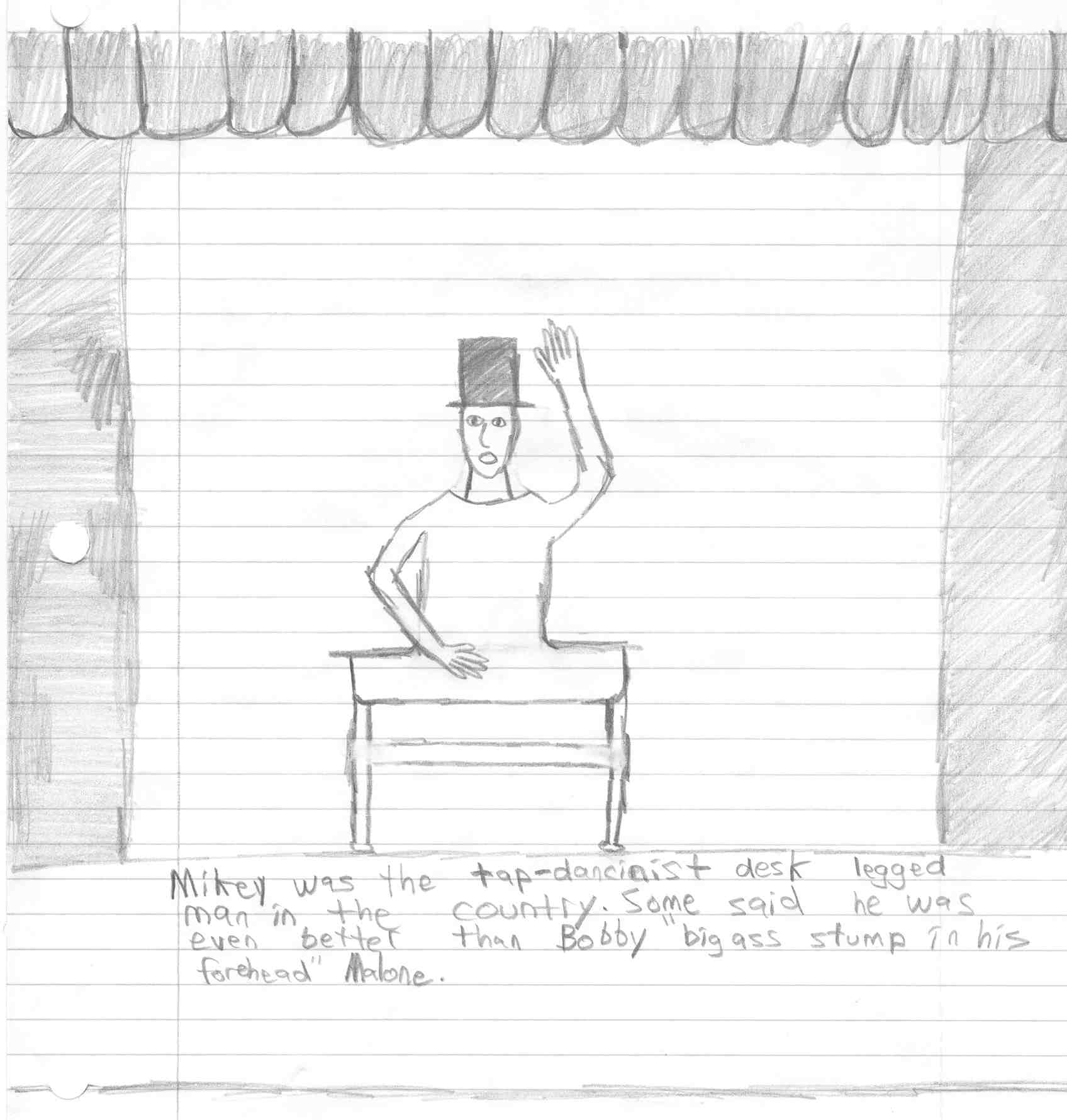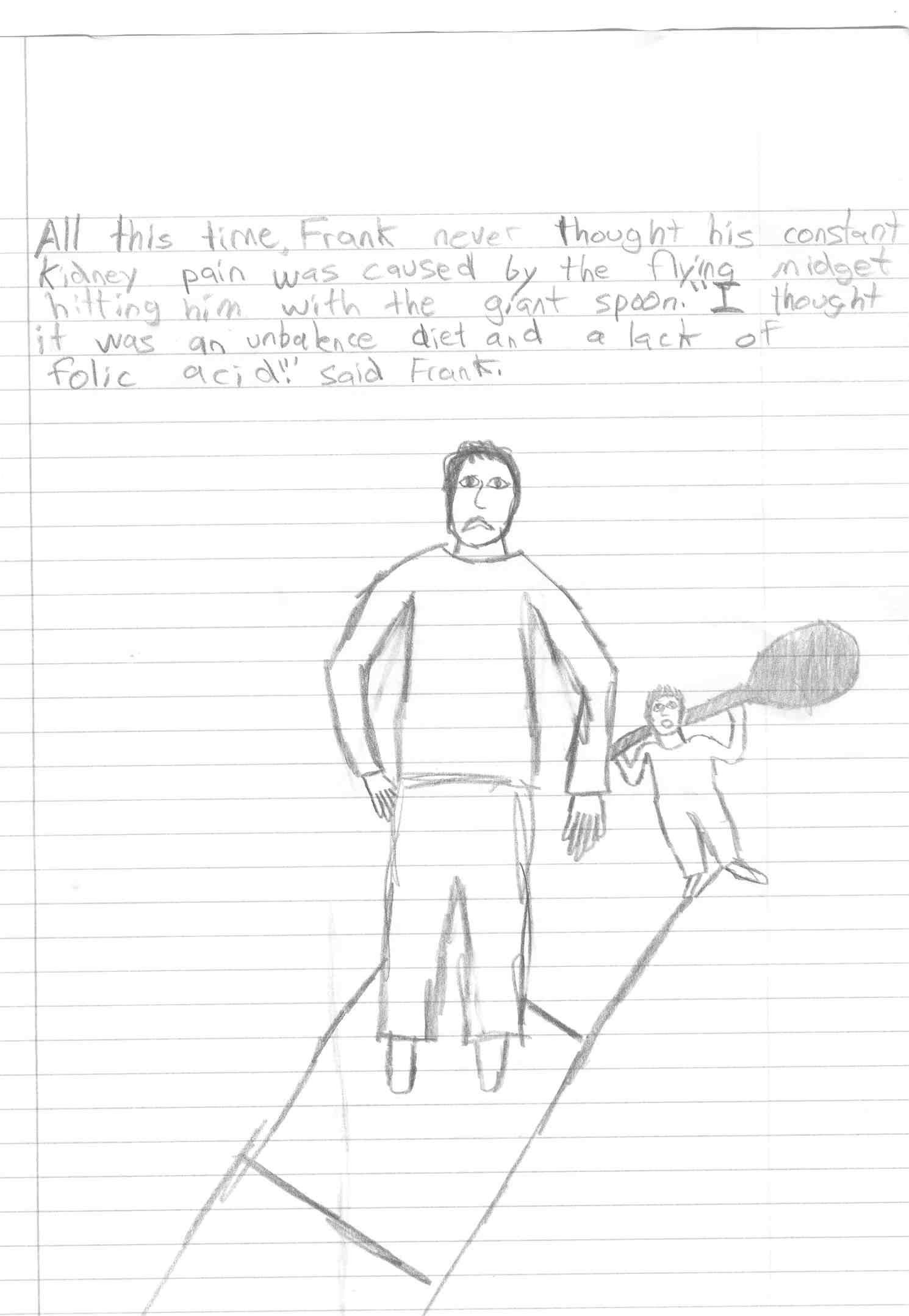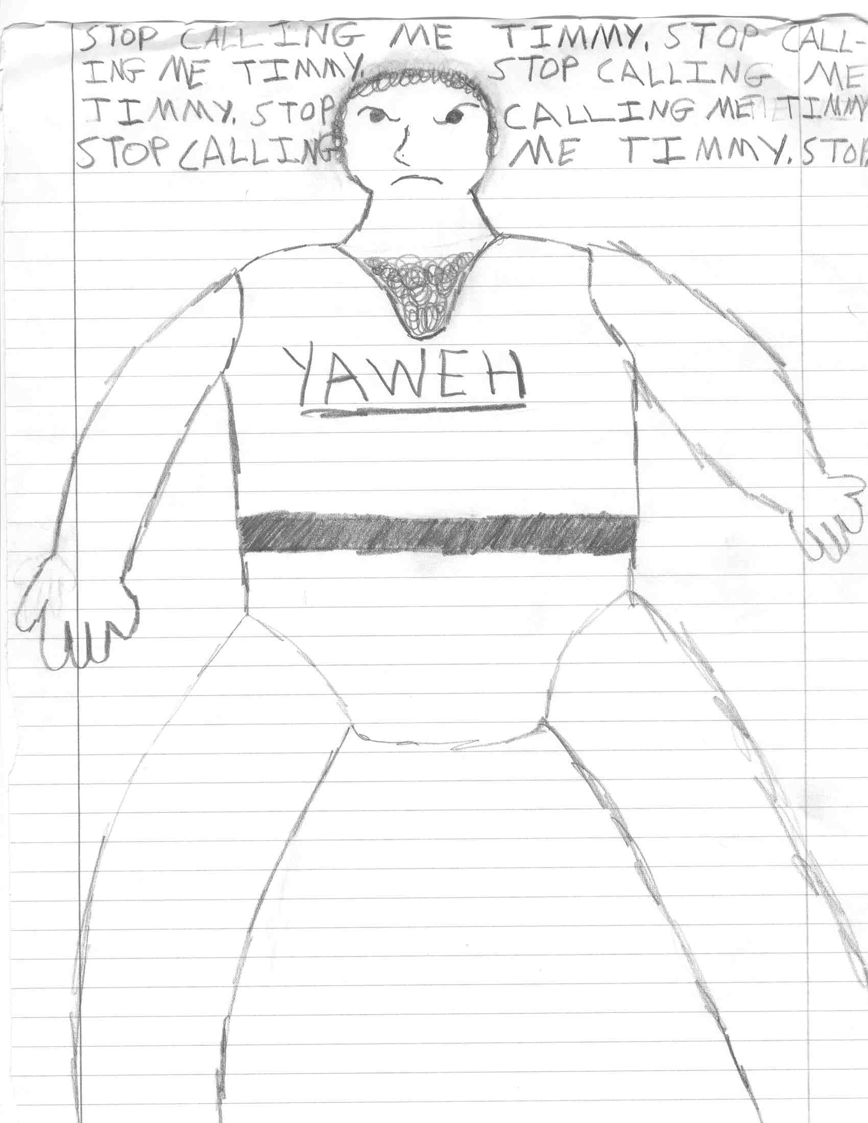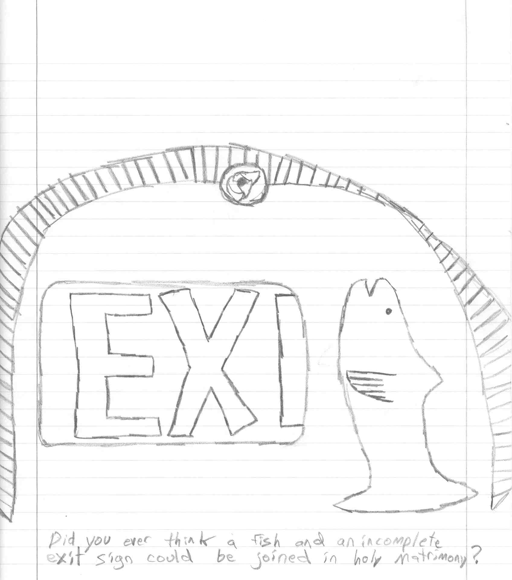 High school started as a challenge for me, not in terms of the work, it just sucked. So, I started going insane. I had no appropriate outlet for my budding insanity. Sometimes in school, I would just start drawing a picture. Now, this is before I learned to draw, so the figures are crude, the shading is often nonexistent, the perspective is skewed, but none of that is the point. (Hey, cut me a break, I was starting to lose it!) The drawings, plus their captions, were really weird. I mean really really weird. Even for me. So now, for the first time ever outside a folder in my room, the byproduct of my ninth grade insanity.