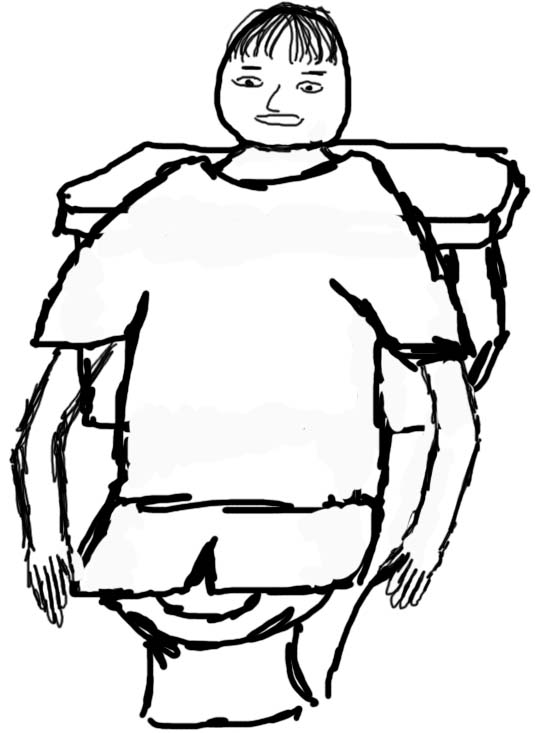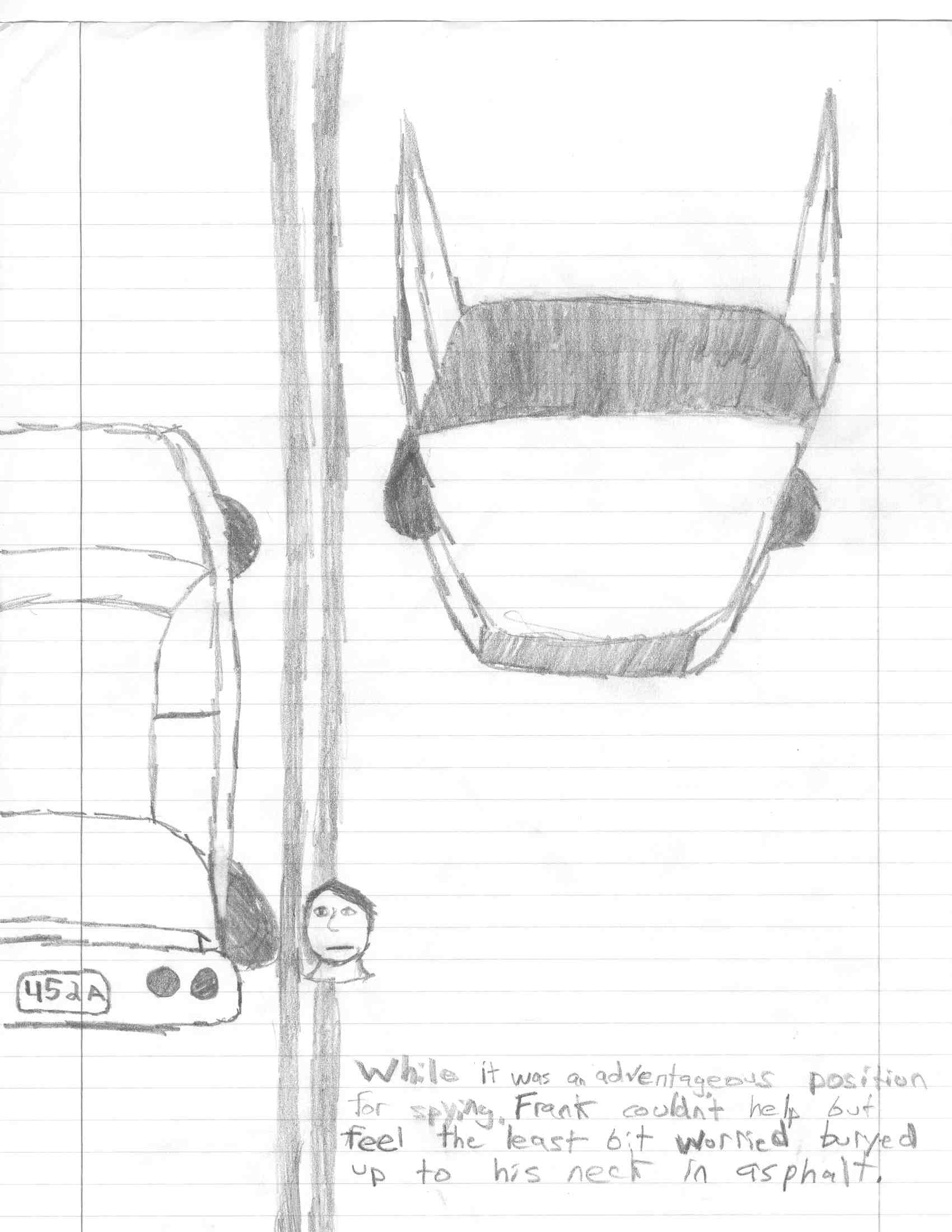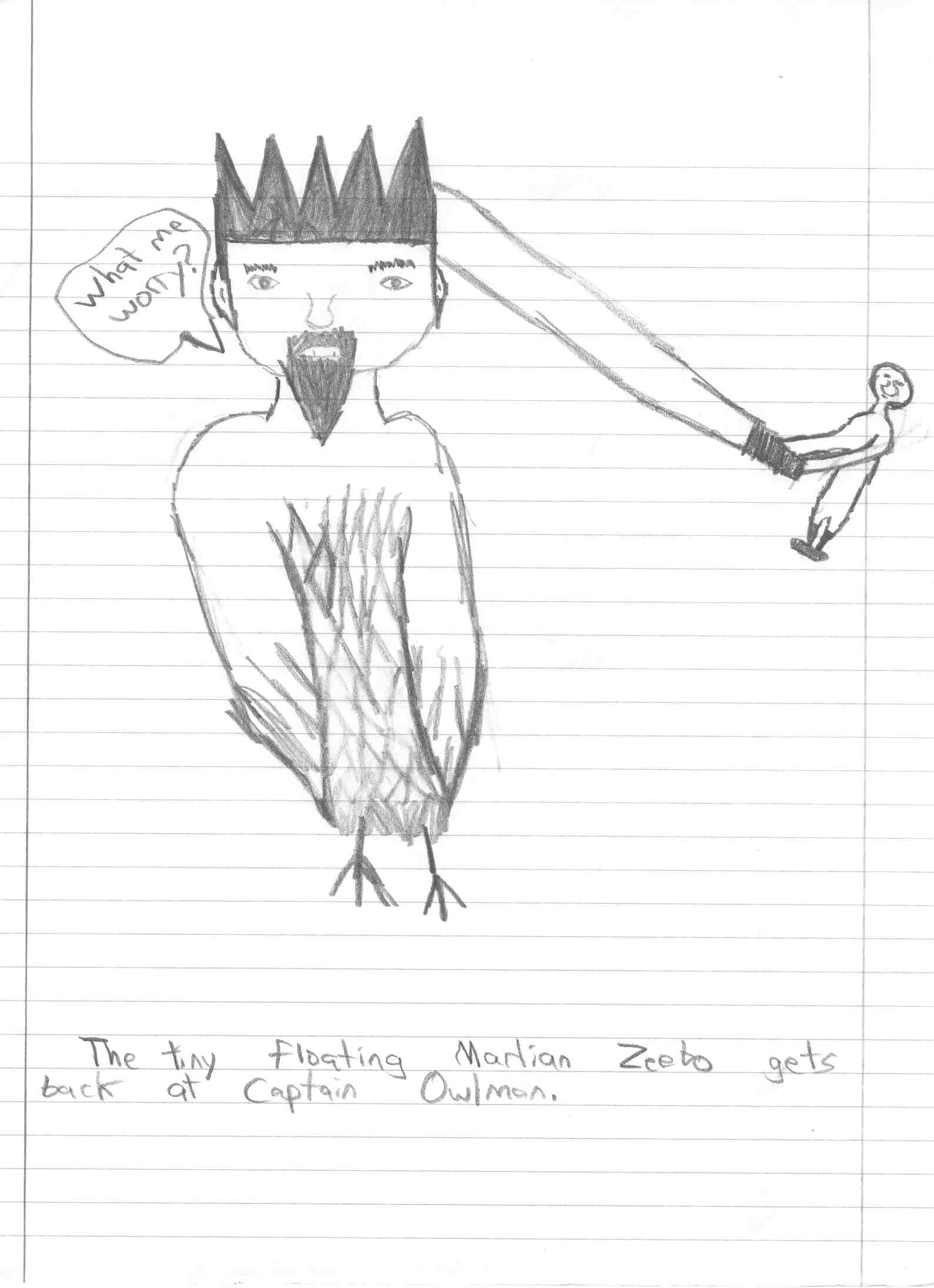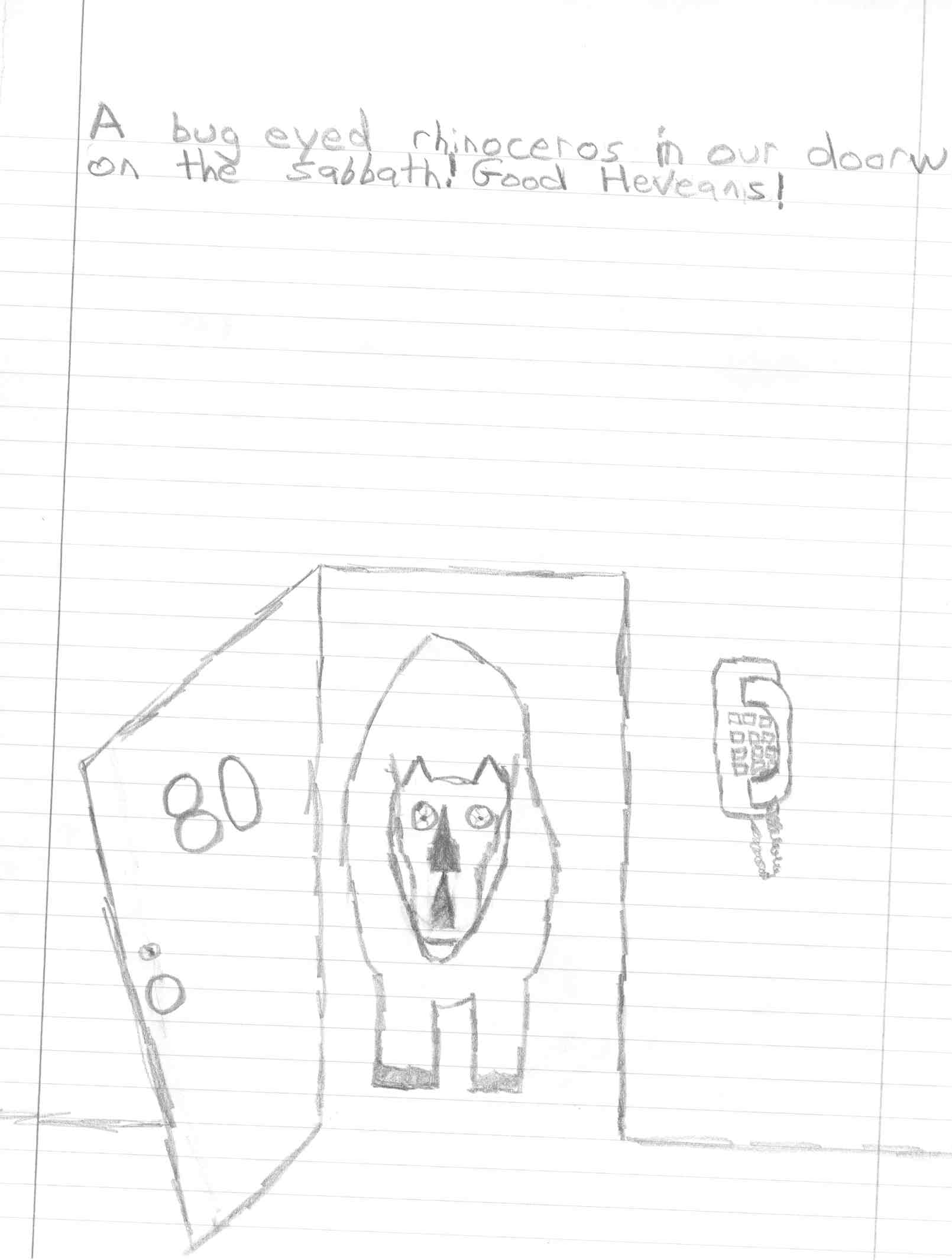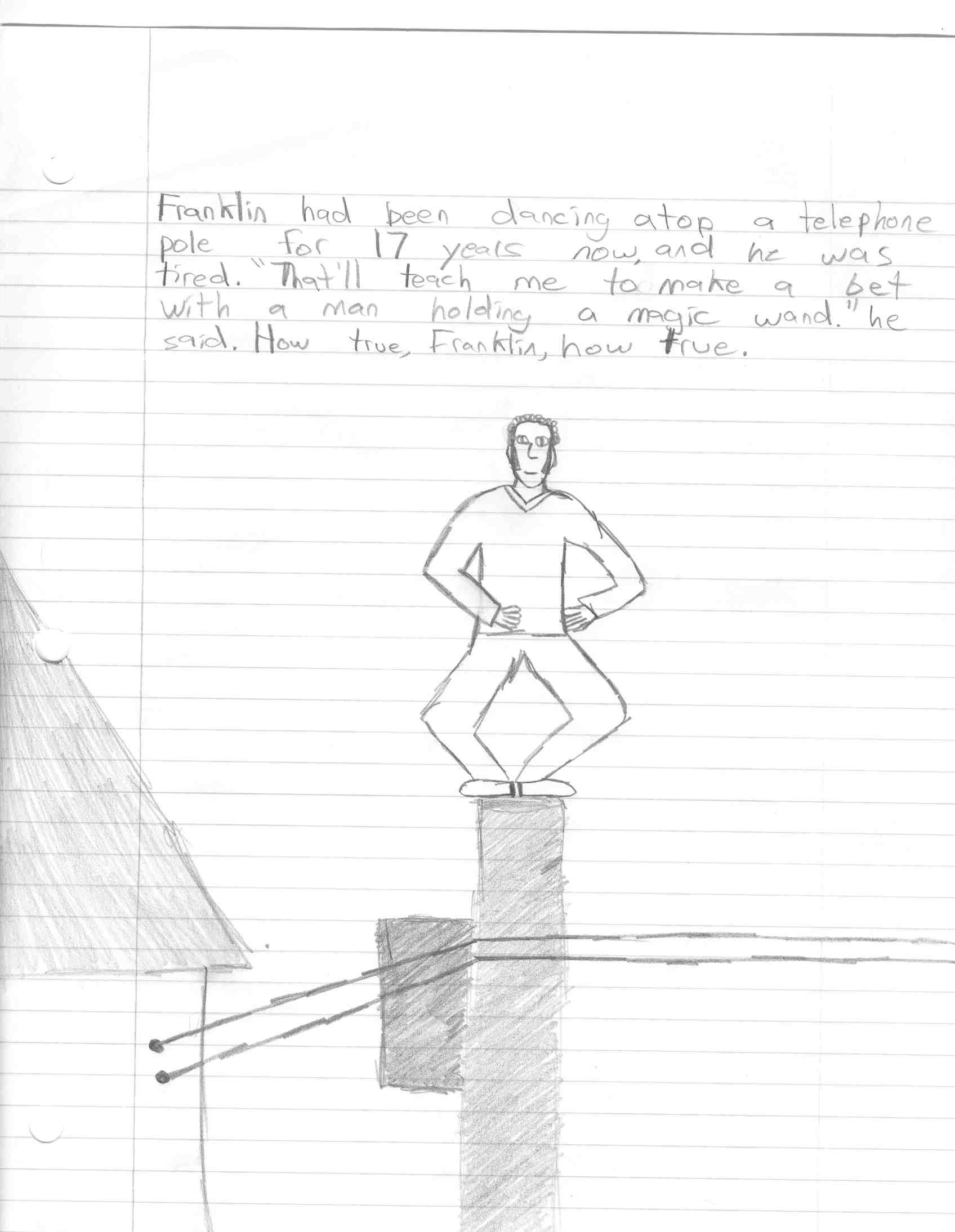 High school started as a challenge for me, not in terms of the work, it just sucked. So, I started going insane. I had no appropriate outlet for my budding insanity. Sometimes in school, I would just start drawing a picture. Now, this is before I learned to draw, so the figures are crude, the shading is often nonexistent, the perspective is skewed, but none of that is the point. (Hey, cut me a break, I was starting to lose it!) The drawings, plus their captions, were really weird. I mean really really weird. Even for me. So now, for the first time ever outside a folder in my room, the byproduct of my ninth grade insanity.