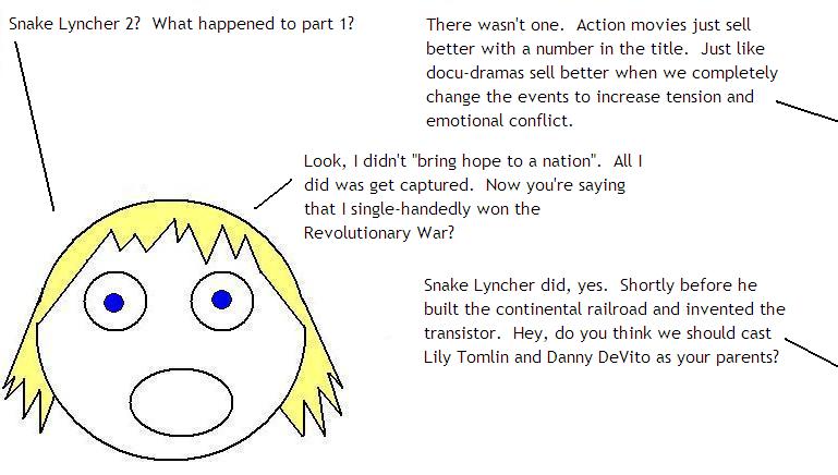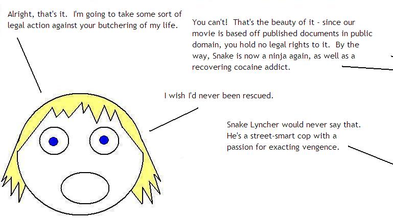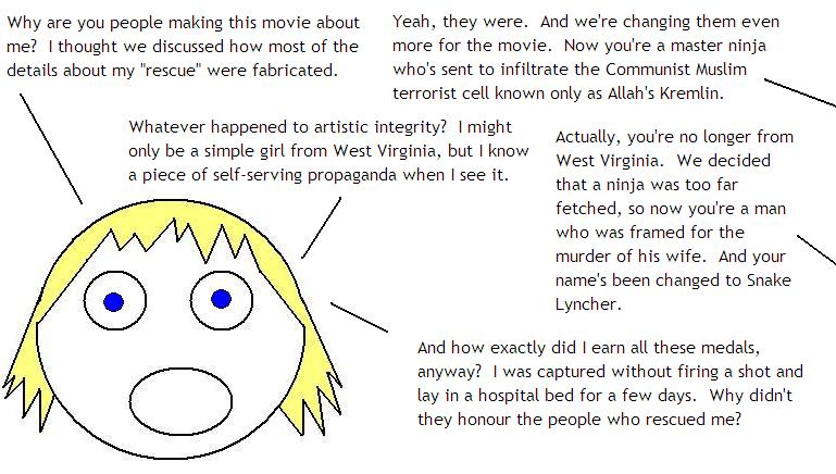 Is it that time of year already? The November sweeps when the television networks throw together cheap made-for-TV movies loosely based on the life of the media's latest poster child? I guess I'd better fire up my VCR and load the tape that already contains The Elian Gonzales Story and The Life of the Guy Who Wrote the Wazzup Commercial. Now peaking at the ten minute mark of her fifteen minutes of fame is everyone's favourite rescued POW - Jessica Lynch! Only mere months after her, um, rescue, we get to watch her life story, including the never-before heard details that have never been heard because they don't exist. The following is an excerpt of an interview between Lynch and the producers of the movie.