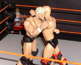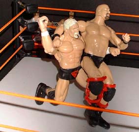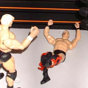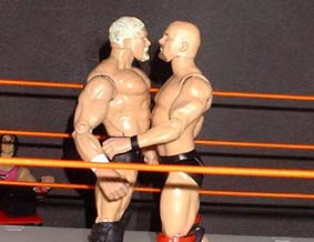 Bret - "Steiner demonstrating his phenominal strength, shoving Austin to the ground"