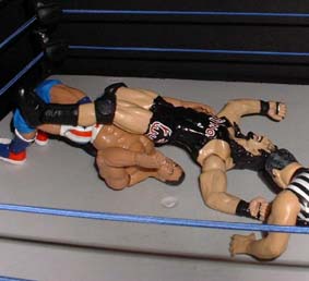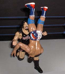 Bret - "He scoops up Angle and delivers a shoulder breaker"