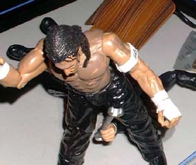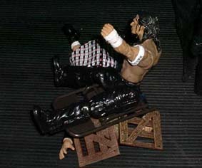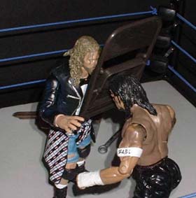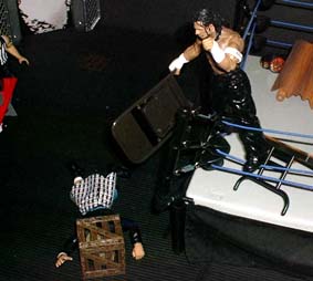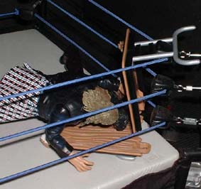 Bret - "Ravens laying on the floor and Sabus climbing up onto the ring apron, a chair in hand"
