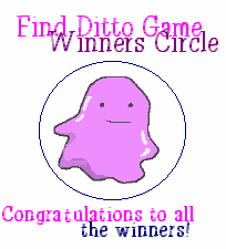 Welcome to the winners circle! Here you will find all the winners for the Ditto Game. I am sorry if you have won the Ditto Game and your name is not here. Either you did not send me your name or I lost your name. Remember you will only be entered if you tell me which pokemon it was that was Ditto!