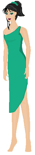 Marcia is wearing a silky green dress, which is designed to match with her leafy hair tie on her hair. The silver necklace she is wearing is designed to match with the pair of earrings she is wearing. This outfit is suitable for a fancy dress party.