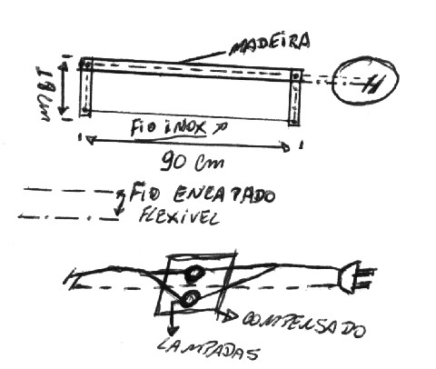 1- O Cortador: eu o montei utilizando um fio fino de aço inox preso em arco feito de cabo de vassoura de 90 cm e utilizei duas lâmpadas de 150W totalizando 300 W, o que foi suficiente para aquecer o fio sem que o mesmo derretesse demais o isopor (se usar um fio um pouco mais grosso vai ter que aumentar o numero de lâmpadas até que se atinja o ponto de corte. Ver esquema abaixo: