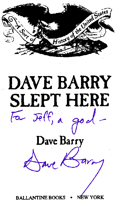 Here is an autographed title page of Dave Barry Slept Here from when I met Dave. Look what he wrote about me! And that was before I came up with this web page. One can only imagine what he thinks about me now.