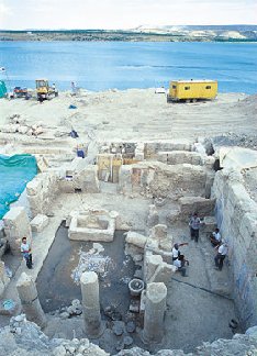 2000-2001. The speed of the excavations have been increased by the support of the Governor of Gaziantep ,Muammer GÜLER, the consorsium of Birecik Dam, Birecik Dam A.S. and a Turkish company,Sanko. During the first 3 month period ,some more Roman Villas (including dining rooms, pools with pillards -Atrium, living rooms, storage rooms and latrines with the mosaics reflecting different myths) were brought to daylight.After the excavations are completed in (A) and (B) zones- regions, which will soon be covered by dam waters, it is planned to start the excavations in section C which is estimated to consist of official buildings. This region will be dig to form an open air museum. Packard Humanities Institute is still waiting for a reply from the Turkish Ministry Of Culture after making a suggestion of 50 million dollars for the excavation in region (C) and forming the open air museum. They have already provided a 5 million dollars contribution. 230 workers and 100 archaeologist have worked during the emergengy rescue excavations