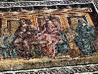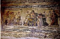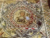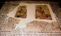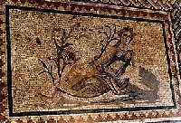 This mosaic which is estimated to be floor of a pool or a dining room.The most important gods of the sea are pictured.At the top Possedion can be seen riding a creature called Hippocam which has the head and front legs of a horse and is a fish at the back.Possedion holds a pitchfork. In the lower part of the mosaic another sea god Oceanos and Tethys which symbolizes femaleness (fertility) in the seas are pictured.The rest of the mosaic is decorated by various sea animals. |