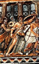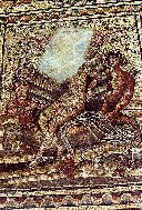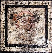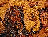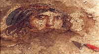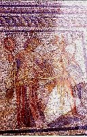 ACHELOOS ,The King of Euphrates... Acheloos is shown with the horn of furtility on his head seattering around fruit and nuts and has a mustache in the shape of wings. He has flowers in his hair and has two horns of furtility on the upper part of his forehead. Fruits and plums and sunseed flowers are shown in this mosaic all sorrounded by branches and the horn of furtilitiy. Acheloos was one of the sons of Okeanos and Tethys.According to one of the myths; Akheloos, who is the neighbour of the King Oineus in Kalydon Aitolia ask the Kings doughter Deineria to merry him. Acheloos had the ability for metamorphosis as the king of river and could turn into different things. He could sometimes be a bull, sometimes a dragon. This talent scared Deineria. When Herakles came to Oineus’s palace and made a proposal for marriage for his doughter , Deineria accepted it at once. But Herakles had a very hard time taking away his bride because of Acheloos who could a big fight tool place between the two rivals. Acheloos used all his talents and Herakles used all his power. Durring the fight Acheloos turned into a bull. But Herakles broke one of his horns. Then Acheloos considered himself defeated and he burrendered. He left the right of marriage with Deineria to Herakles but asked for his broken horn to be returned to him. Herakles in return presented him with, one of flower and fruit making horns of goat Amaltheia the wet nurse of Zeus. Some authers claim that this wonderful horn actually belonged to Acheloos himself. Today the Acheloos river is called Astropotama and flows into the Greek sea at Patlas Bay. ANTIOPE and SATYROSAntiope was a very beautiful woman. Zeus had fallen in love with her ,after seeing her beautiy Zeus approaches Antiope in shape of a Satyros (man participating in a Dionysos ceremony by drinking wine) and steals Antiope’s heart . Zeus had two children from her. After a time, Zeus leaves her and Antiopes leaves her home and marries with Sicyklon(Cyclon), the king of Epopeus. The GYPSY Girl (GAIA) This mosaic which was found during the Zeugma excavations in 1992, became the symbol of Zeugma because of the mysterious look she had in her eyes.The girl’s resemblance with gypsies caused this mosaic to be named as “Gypsy”. Some sources claim that “she” is GAIA, the Goddess of the Earth.In Mythology, it is considered that GAIA is the first element allgod’s ancestors have derived from.Although GAIA has a major role in Hesiodos’s Theogonia,it is never seen in Homeros’s poems. According to Hesiodos ,GAIA without a male element gave birth to the “sky” and the “mountains” and also the “sea”.After the birth of the sky GAIA coupled with him and therefore all her children became real Gods and were not just simple elements of power first six titans Okeanos,Koios Krios.Hyperion,Iapetus and Kronos and six titanids; Theia, Reia, Themis, Mnemosyne, Phoibe, Tehys were born.All of these were feminene Godlike creatures.The youngest one of this generation was Kronos.It was followed by Kyklops. These were godlike creatures that ruled the “thunder”,”Lightning”,”thunderbold”,There names were; Arges, Steropes and Brontes.And at last from Ouranos’s loves gigentic Hekatogkheirs were born.They were much for violance and had hundred arms. DEMETER The mosaic which the Goddess of earth with the horn of fertility on her left shoulder is shown in a square pool crowned with flowers and ears of wheat right to the west of Gods related to Euphrates.The mosaic artist has created an equation of production by first ,having the water go through the pool where the God of Euphrates are pictured and have it reach the pool where the Goddess of fertility Demeter is,and this way he describes the abundance and fertility. . In addition Demeter’s bust, is placed in the middle of decoration that is seen in the following order, an octagonel band an two equilateral rotated 90 degrees and placed inside each other and the eight axe description taking place on each of eight corners at the ornamentation. This composition with the geometric decorations of number eight is surrounded by a circular band placed inside a square, decorated with plants. The number eigth must have something to do with Demeter’s daughter Persephone. Because Zeus had decided that she should spend 2/3 of year (8 months) at the time of blossoming and fruit harvest time with her mother Demeter and the other 1/3 the winter period with her husband Hades. The Birth of APHRODITE (VENUS)