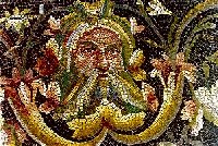 Oceanos, the archaic era (except for Mediterranean) lived with Tethys who symbolizes the feminine component in the sea.It is believed that all rivers and streams came into existence from Oceanos and Tethys.In this mosaic that was found in excavations in Zeugma, which is estimated to be the floor of a pool pictures, Oceanos and Tethys were surrounded by sea creatures.Also Eros figures riding dolphins can be seen in the mosaic. SILENOS