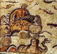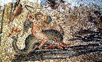 EROS and DOLPHINDuring the excavations sponsored by Peckard Humanities Institute, this mosaic was brought to day light which shows the god of love Eros riding on dolphins. POSSEDION,OCEANOS and TETHYS