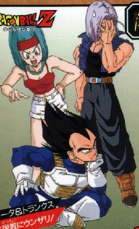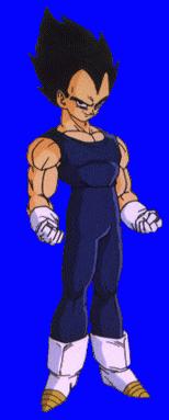 This is my webpage on DBZ.=) Vegeta is a super saiya-jin from the planet Vegeta(Vegetaseii). He has the ability, like most saiya-jins, to transform into a super saiya-jin. He and Goku are always going at each other, but Goku remains one step ahead. Vegeta later marries Bulma(ugh!) and becomes father to Trunks. Vegeta never really shows affection to anybody until the end of the entire series when he realizes how much he should have paid attention to his wife and son. After that, he becomes a little nicer.=)