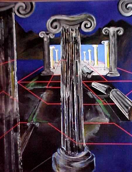 The area of enlightenment (sunlit plaza in the distance)is unreachable by reason of geometries and perspectives which prevent and contradict normal progress through space. The columns with Ionic capitals still retain faint images of their original inspirations of rams' heads(superstition). We stand in the darkness of the foreground."