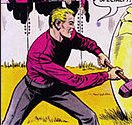 (Challengers of the Unknown I #3) - Professor Curtis showed the Challs a film of a monkey playing in fire with no ill effects and told them the monkey had ingested a chemical from a meteor that landed on Earth and gained the ability to withstand extreme environments. The chemical was not ready to be tested on humans, but Rocky insisted on volunteering. He took the chemical, and went up in a rocketship to see if he could survive reentry. During his flight the monkey lapsed into a coma, and Curtis feared the side effects the chemical would have on a human. Rocky survived the heat friction of reentry and gained fantastic powers, changing size, and generating intense heat and cold, but was unhinged, and fled after attacking his teammates. Rocky went into the woods, and the Challs organized a search party. Rocky stumbled on the cabin of gangster Chopper and his gang, and Chopper, seeing potential in his powers, decided to use him as a pawn committing crimes. The Challs found them, and when Chopper shoved June Rocky came to is senses and took out the criminals. The chemical wore off, and Rocky lost his powers and his mind returned to normal.